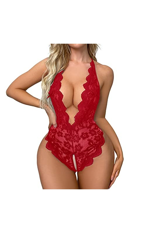 Abien Womens Sexy Bodystocking Plus Size Valentine’s Day Lingerie Red Lace Babydoll Lingeries Sexy Pajama Bodysuits for Women