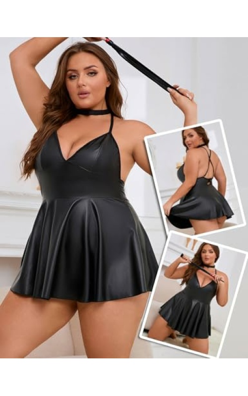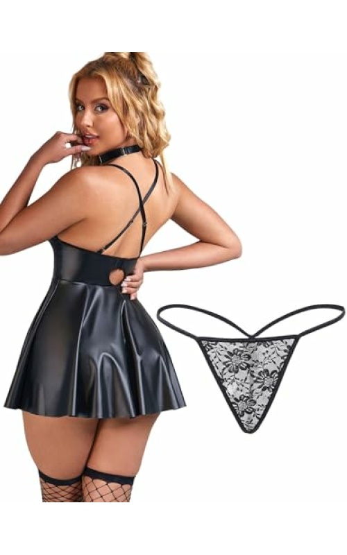 ohyeah Faux Leather Lingerie Set for Women Plus Size PU Lingerie V Neck Backless Babydoll Chemise Mini Lingerie Dress;G String Thongs for Women