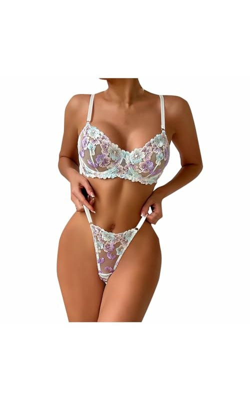 Womens 2 Piece Floral Mesh Bra and Thong Sexy Lace Lingerie Sets Sheer See Through Boudoir Outfits Slutty Babydoll
