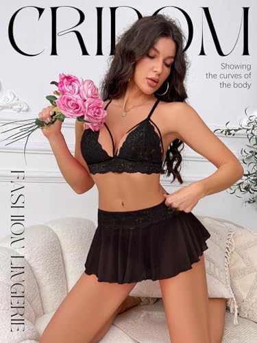 CRIPOM Sexy Lingerie for Women Naughty 3 Piece Lace Bralette, Mini Skirt with G-String Crotchless Lingerie Outfits