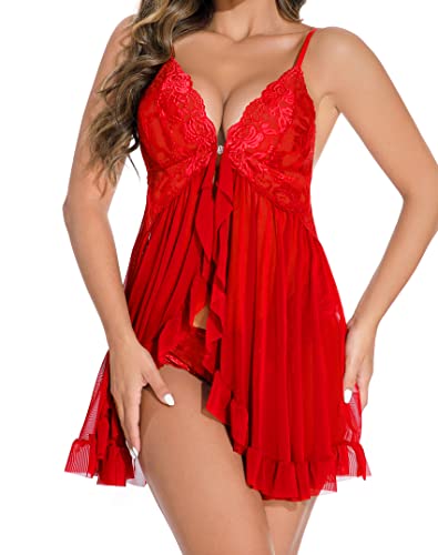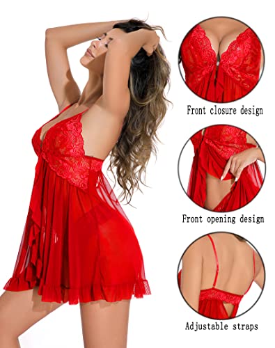 LNRFHI Women Lingerie Front Closure Babydoll Lace Chemise V Neck Ruffle Nightgown Sexy Sleepwear