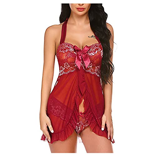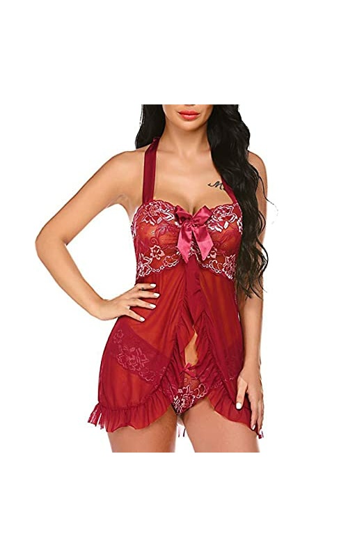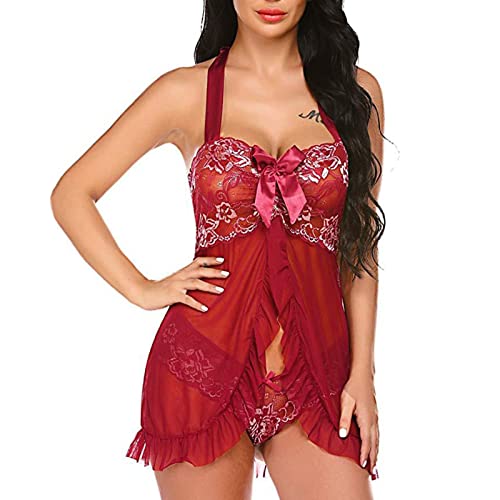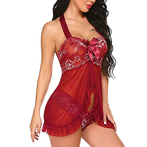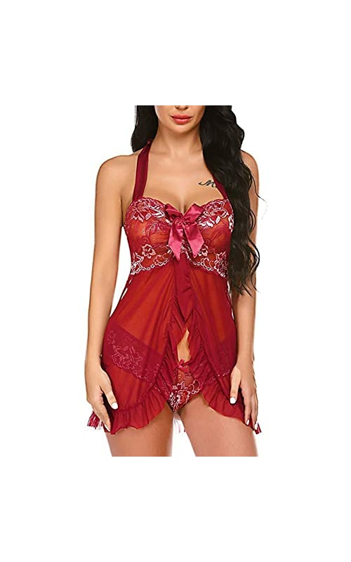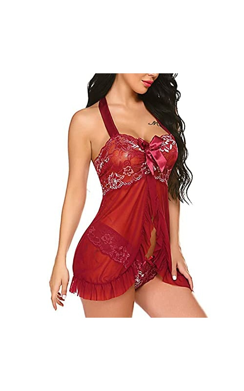 Women Lingerie Lace Babydoll Sexy Mesh Lingerie with Panty Set Chemise Nightwear Open Front Low Cut Ruffle Nightgown