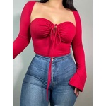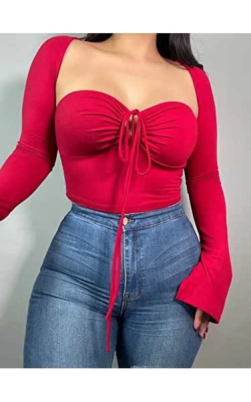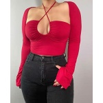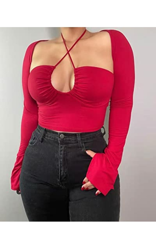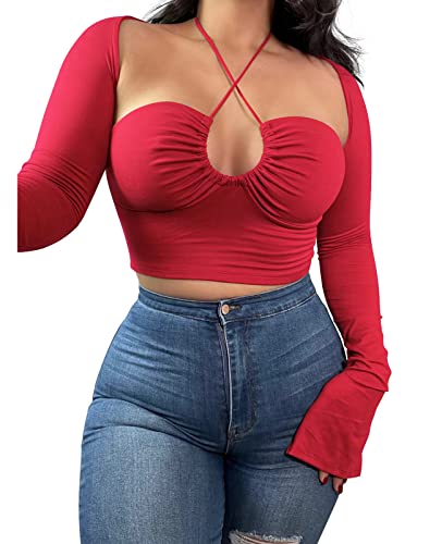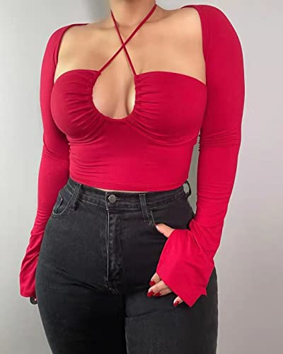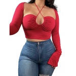 KERPELLY Women’s Sexy Halter Criss Cross Tie Up Crop Top Basic Long Sleeve Cut Out T Shirt
