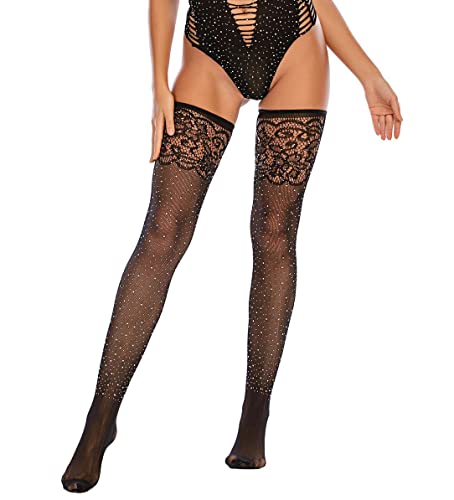 FANCAME Womens Sparkle Thigh High Stockings Patterned Floral Black Stockings Rhinestone Stay Ups Socks Tights